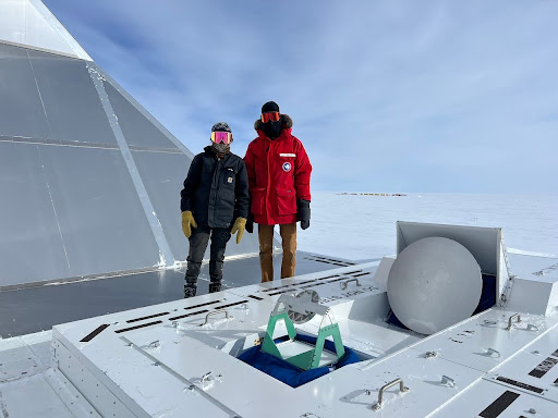 SPT-SLIM collaborators Karia Dibert (Caltech) and Adam Anderson (Fermilab) installing secondary optics on the South Pole Telescope (Credit: Simeon Bash).